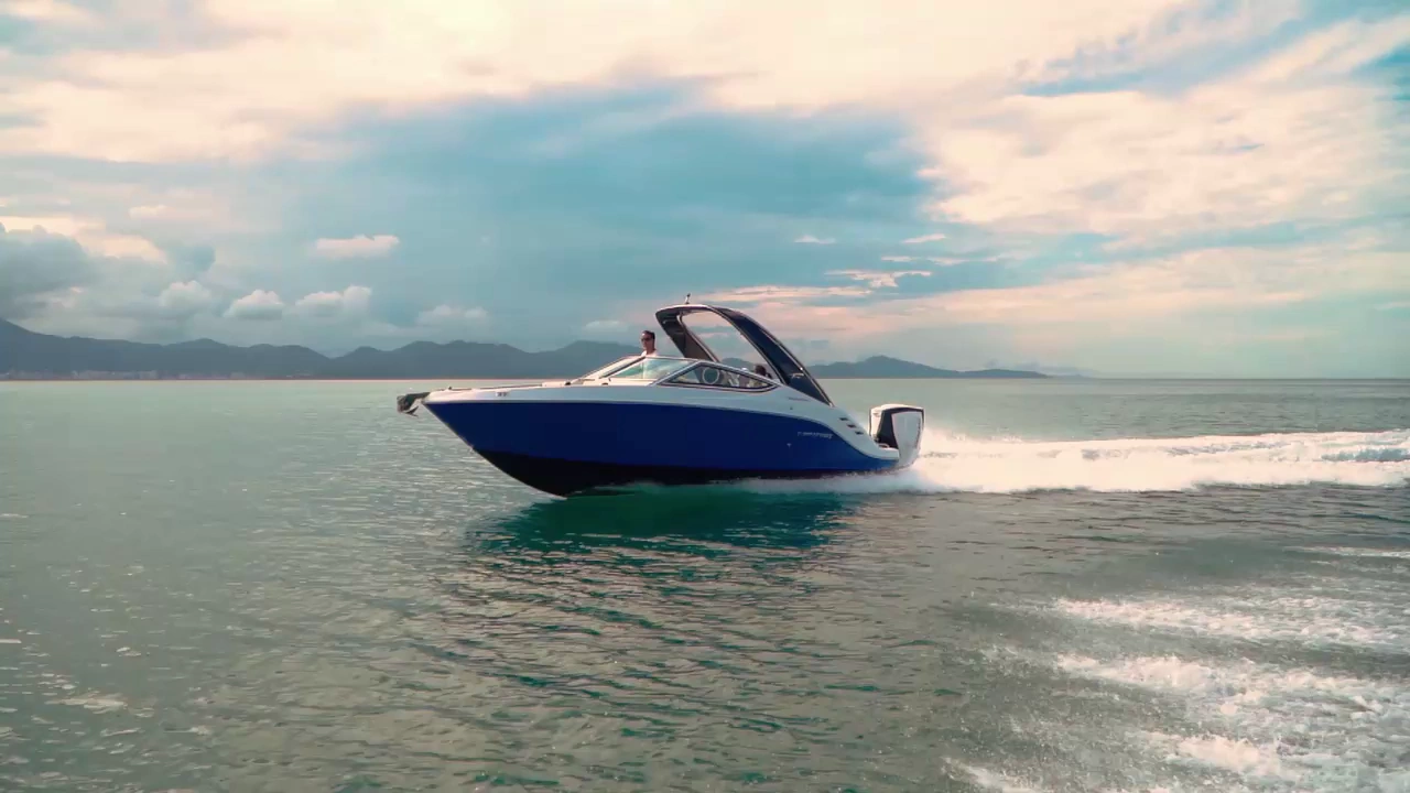 Experience the sportiness of the outboard engine while enjoy ample space to delight in leisure, with a smart and versatile solarium, optional grill, fresh water system, and stainless steel arch for water sports.